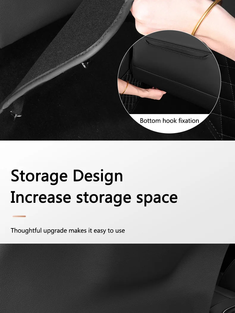 This leather anti-kick pad protects your car seat back from dirt and damage. It features multiple pockets for storing essentials like magazines, drinks, and phones. Made from durable PU leather, it’s easy to install, water-resistant, and simple to clean with a damp cloth. Suitable for most car models, it keeps your vehicle tidy and comfortable on the go.