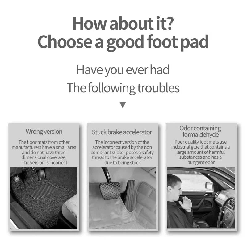 The car mats include front and rear rows. Using 3D laser scanning technology, the original car data is accurately scanned to ensure that the mat completely covers the car floor. Details such as throttle and brake were noted during the design process, which will not affect you when driving.